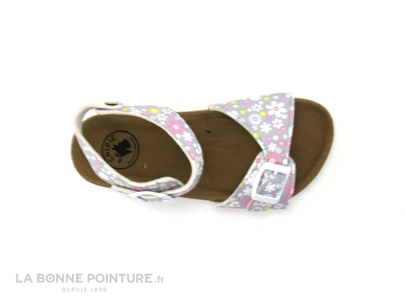 Ce nu-pieds fille Chipie est imprimé de fleurs blanches, roses et jaunes sur fond gris clair.