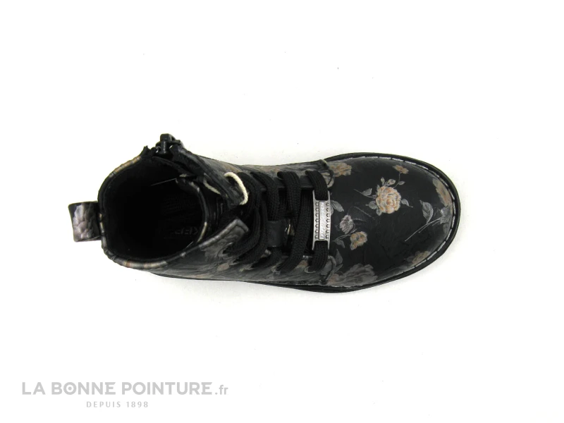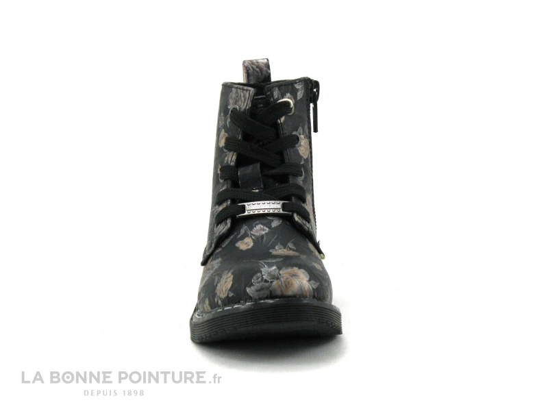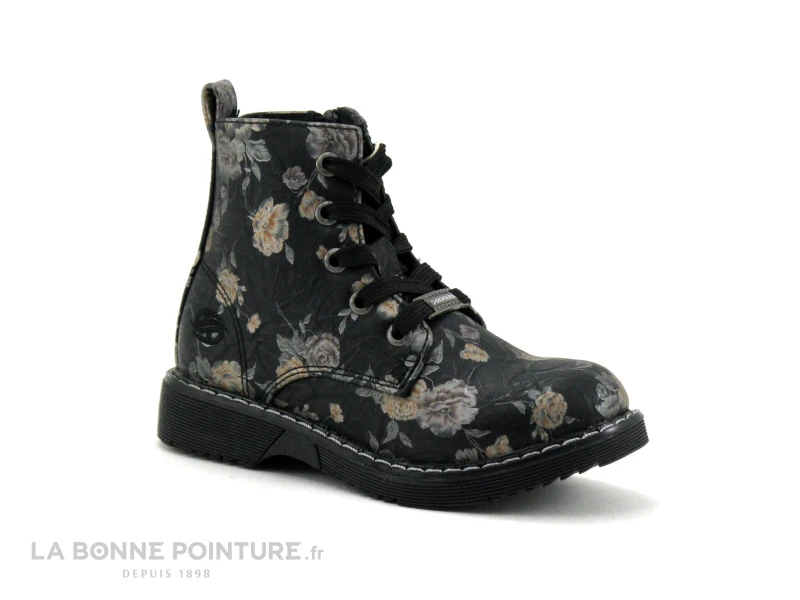 Cette jolie bottine fille Dockers 43CU738 est en simili cuir noir imprimé de fleurs aux tons de gris argent et de beige doré.