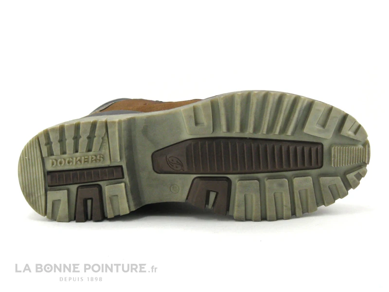Cette chaussure montante Homme Dockers est marron nuancé aspect peau de pêche, avec une partie marron foncé autour de la cheville.