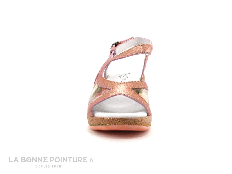Ce nu-pieds Femme est en cuir velouté rose corail, avec des parties imprimées de feuilles multicolores.