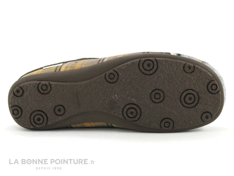 Ce chausson fantaisie Femme est en velours écossais aux tons de marron, de gris et de jaune, avec un adorable chaton gris qui joue avec une pelote de laine.