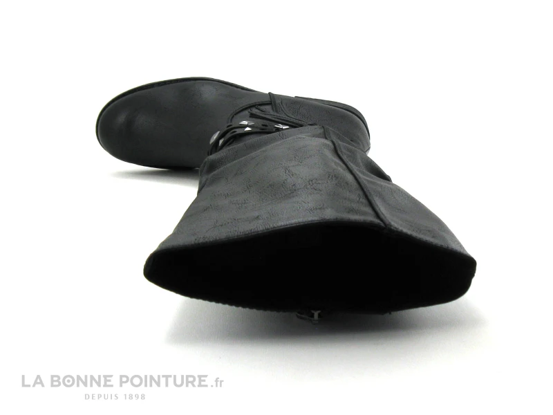 Cette botte Femme est noire avec un bel aspect veiné, ainsi qu’une tige légèrement froncée.