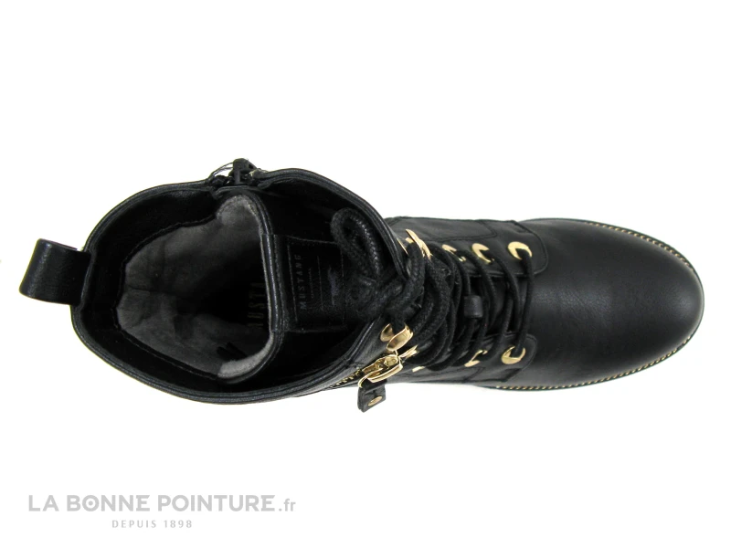 Cette ravissante bottine Mustang Femme est noire avec des petits détails Or qui donnent tout son charme au modèle : zip décoratif en haut des boots, liseré doré en-dessous, oeillets et crochets métalliques, sans oublier les petits clous sur la semelle…