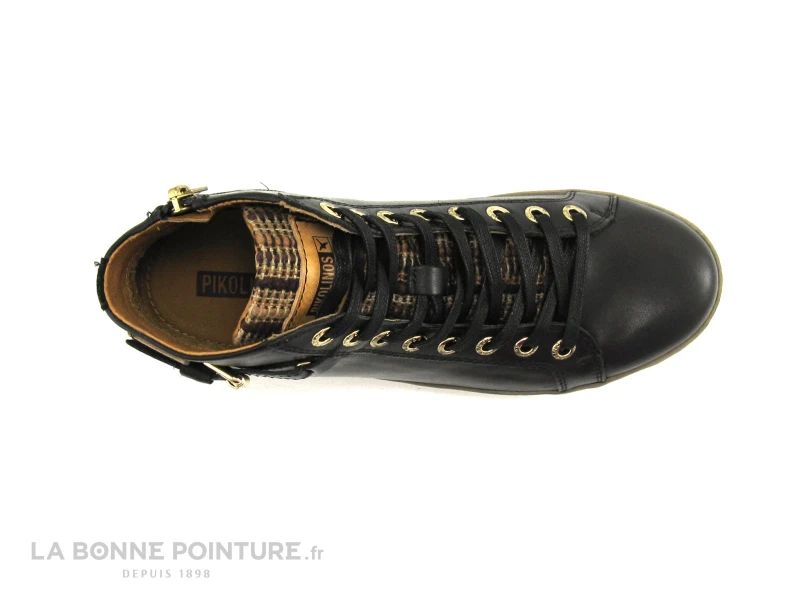 Un lacet en coton noir traverse 8 oeillets métalliques couleur Or, pour ajuster les chaussures Pikolinos Lagos à votre morphologie.