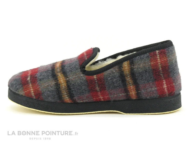 Ce chausson homme est en textile à carreaux bordeaux, noir et gris, avec une touche de marron orangé et de beige.