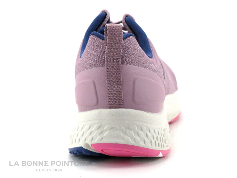 Cette chaussure de sport Femme Skechers Performance est en textile et matières synthétique rose/mauve, avec la doublure bleue qui dépasse sur l’encolure.